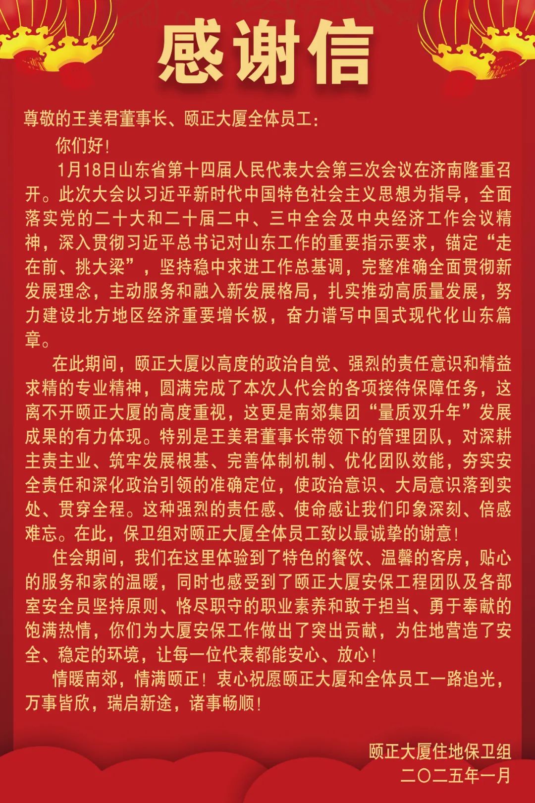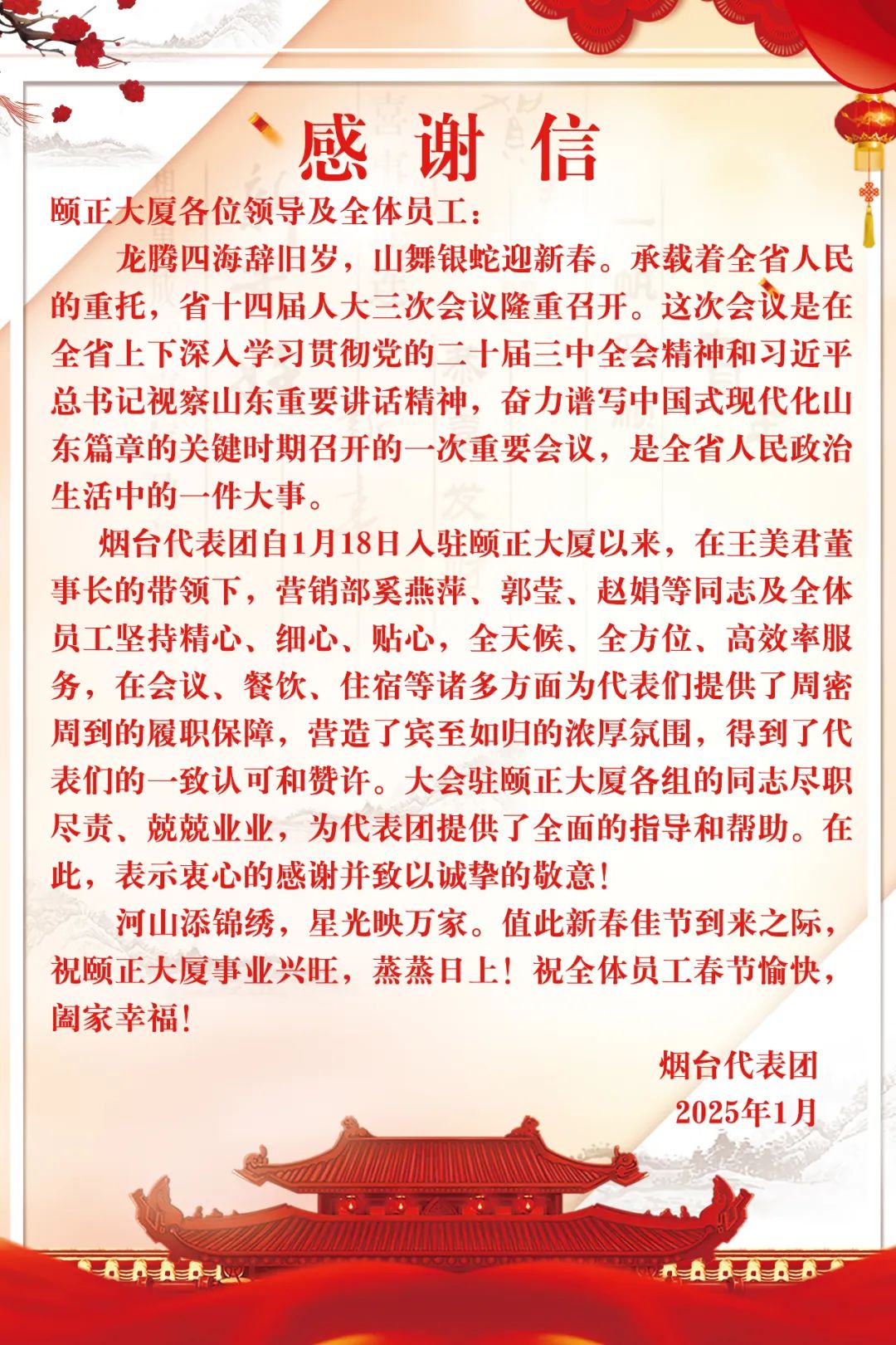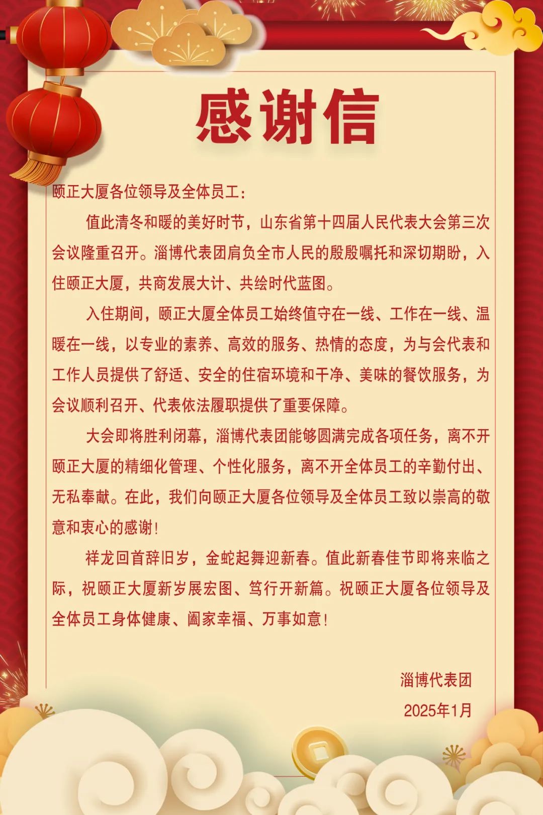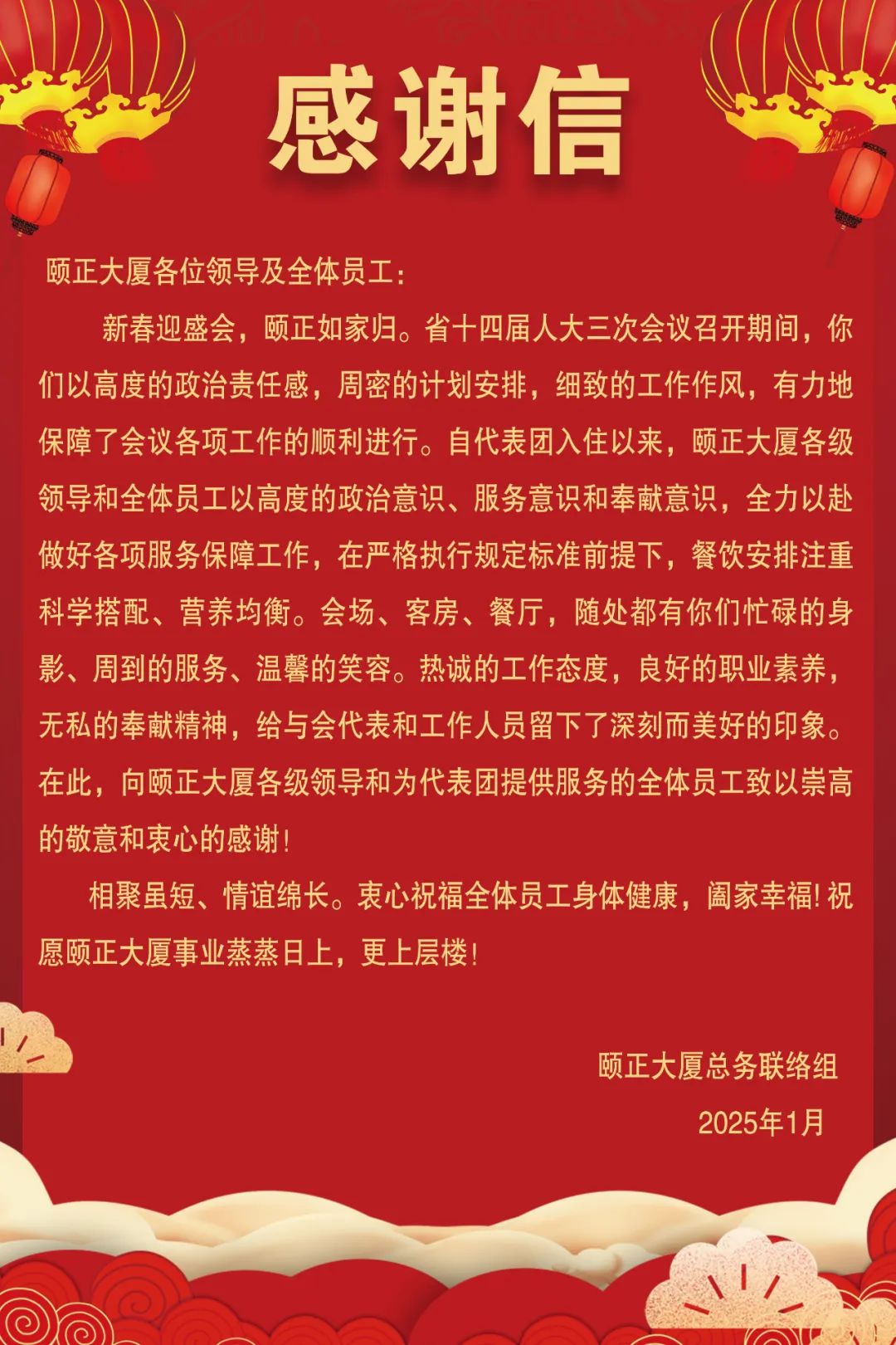 蛇年已至,万象更新。颐正大厦将以此次接待为新起点,深入总结经验,奋力备战开新局、精心服务出新彩,坚守匠心,不辱使命,不断优化服务流程提升服务品质,继续砥砺前行,以更高标准迎接每一次服务接待,以更加昂扬向上的姿态实现新一年的创新发展!
