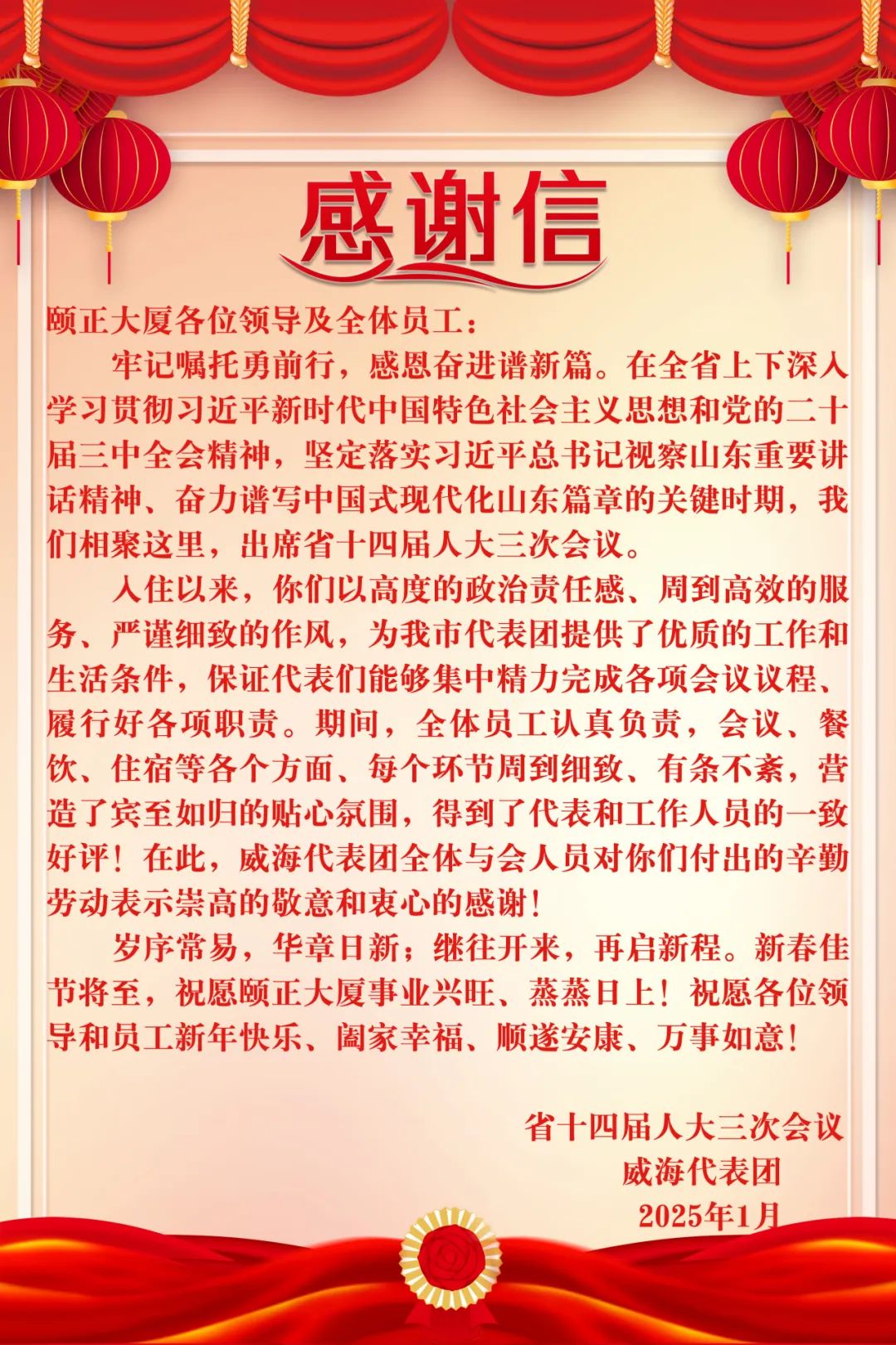 山东省第十四届人民代表大会第三次会议于2025年1月18日至1月24日在济南隆重召开。山东颐正大厦作为会议指定接待单位,严格落实太阳集团tcy8722集团党委的指示要求,全力以赴、周密部署,全体员工以崇高的政治责任感和饱满的工作热情,切实落实好每一项工作任务,用热情周到、务实高效、细致入微的服务圆满完成对淄博、烟台、威海3个代表团、10个工作组,共计125名代表及131名大会工作人员的接待保障任务。